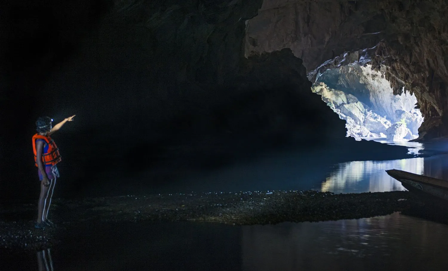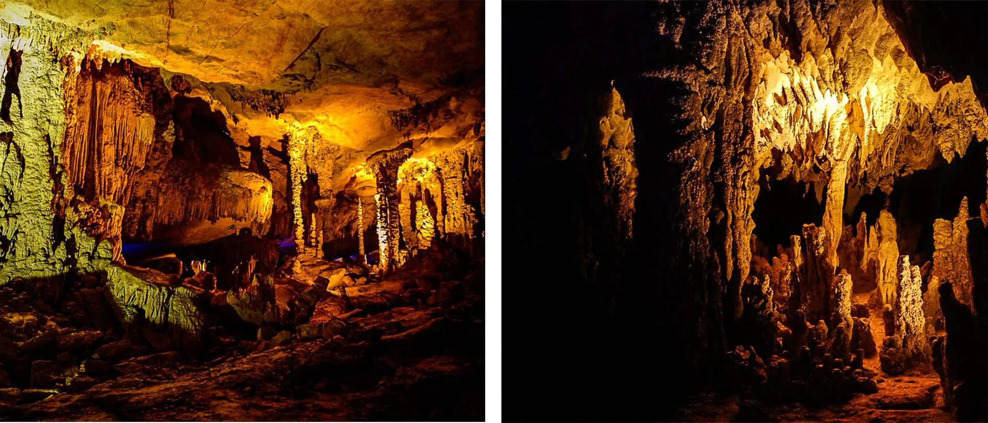 乘船的旅程将游客带入洞穴,停在一个令人印象深刻的石灰岩形态的洞室,被色彩斑斓的泛光灯吓人地照亮。游客穿过这个区域,惊叹于成千上万年来,石灰岩逐滴逐滴地沉积形成的巨大石柱。