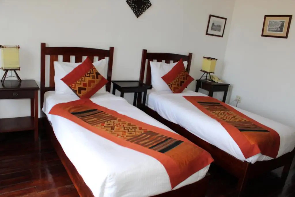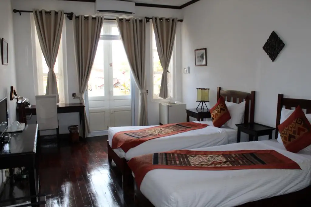 Colonial furniture, parquet flooring and Lao textiles : the standard room is simple and elegant. With high ceiling, it is a very pleasant room. With two simple beds (possibility of moving them closer), it can also be connected to a Superior room (Ideal for children).