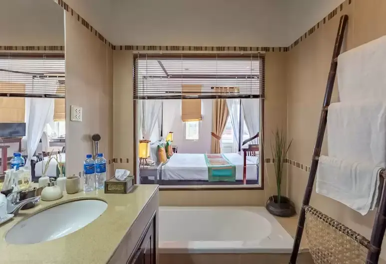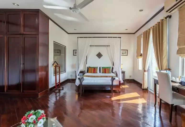 With its four-poster-bed, parquet flooring and lao textiles, the Deluxe room has a great view from its large balcony full of flowers. High ceiling, flat screen LCD TV, it offers unique comfort. The spacious bathroom has a bathtub and separate shower.
