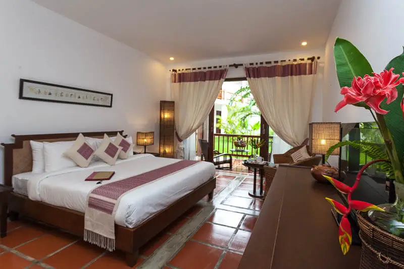 Thirty-four rooms with large balconies are located within the manicured gardens. Each has a stylish and subtly different design that combines exotic wood and rattan furniture, soft furnishings reflecting the traditions of eight Lao ethnic groups, and authentic art and craftwork by local artists and artisans. An herbal spa is also part of the hotel, comprising three traditional pavilions looking over the mountains.