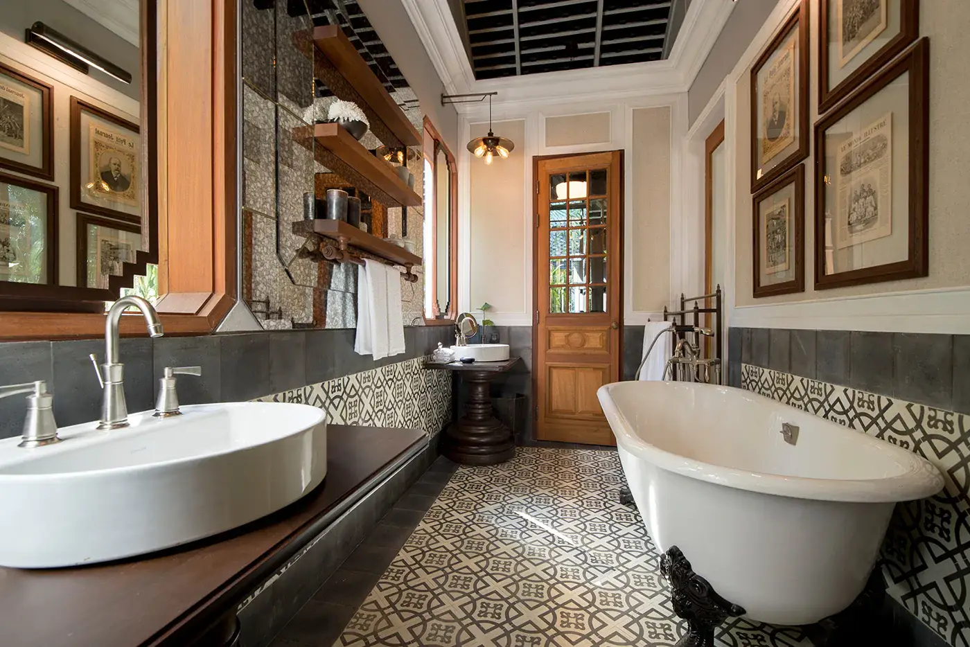 RIVERSIDE SUITES: The stunning interiors of the Riverside Suites by American designer Bill Bensley-found throughout the entire property-reflect the unique heritage of Luang Prabang, a melting pot of royal influences, colonial French explorers, adventurous traders, and colorful hill tribes. Choose to relax in the large living room or on the outdoor daybed, as you watch the river gently flow just in front of your room. The bathroom features a rain shower and classic bathtub with double amenities.