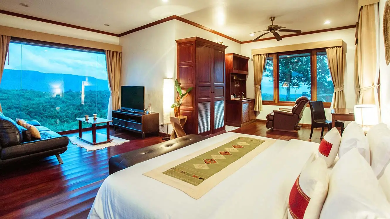 Sabaikai villa – our honeymoon suite. The one and only villa offer a sensual villa experience with expansive mountain views. Sabaikai villa features private balcony and pool, large Jacuzzi, Sofa set with home theater, Lazy relax chair, luxury bed with 7′ super king size. Take in breathtaking views of Bolaven plateau, southern Laos through the natural tree and nature of Laos from your luxury Champasak accommodation.
