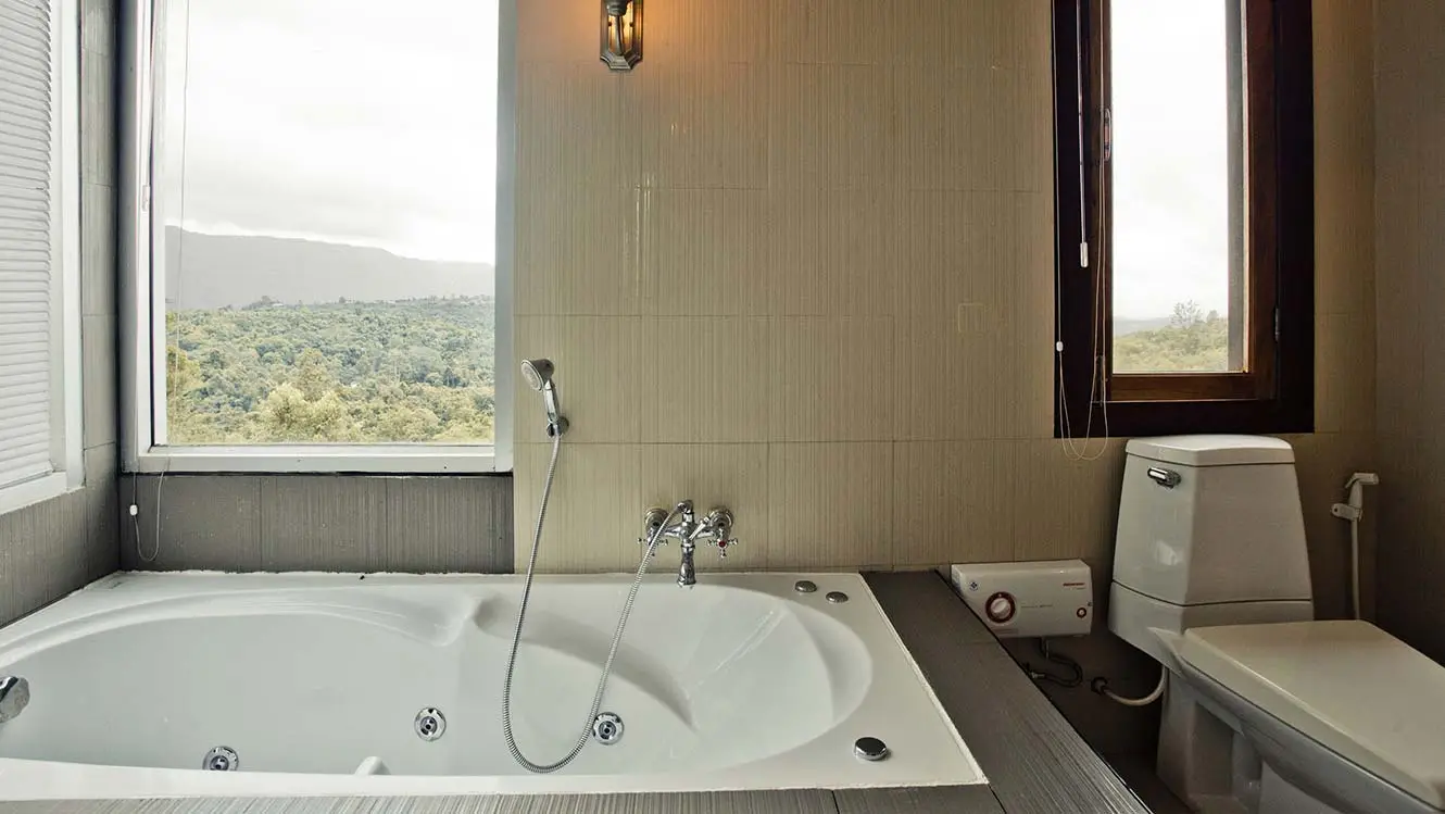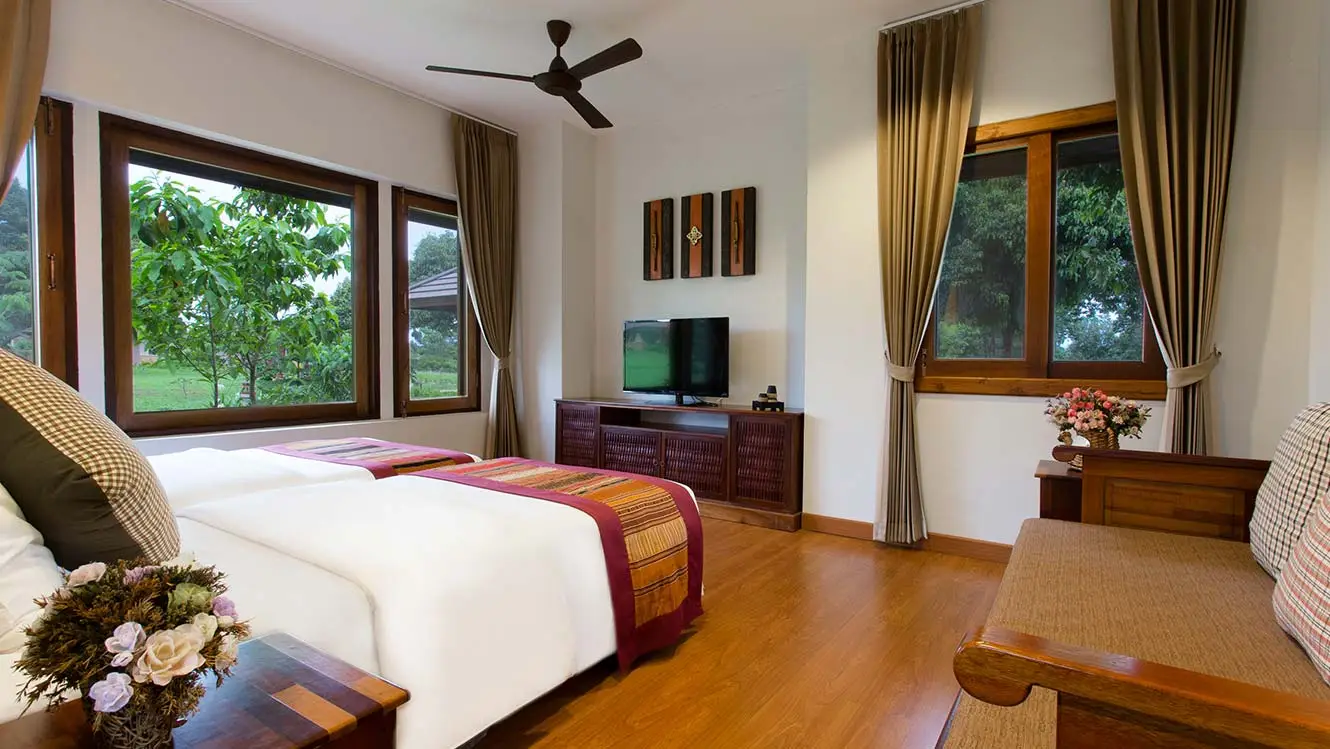 DELUXE VILLA – DOUBLE BED – TWIN BED: The spacious Deluxe villa is suitable for 2 persons and offer anything a guest could wish for. The interior and the gardens reflect the peace and space the surroundings offer. The big windows in the room offer a wonderful view of the nature green hills.