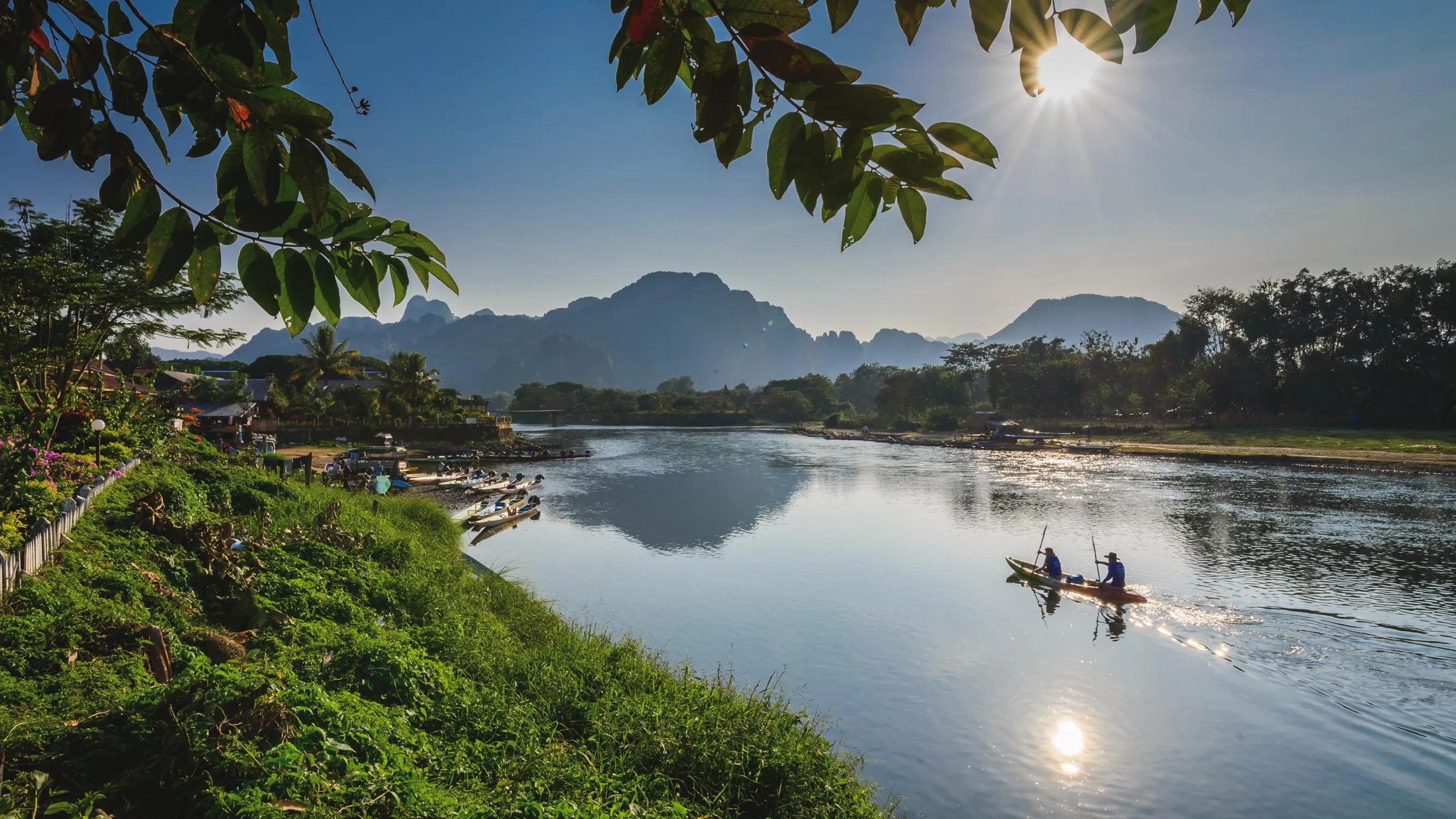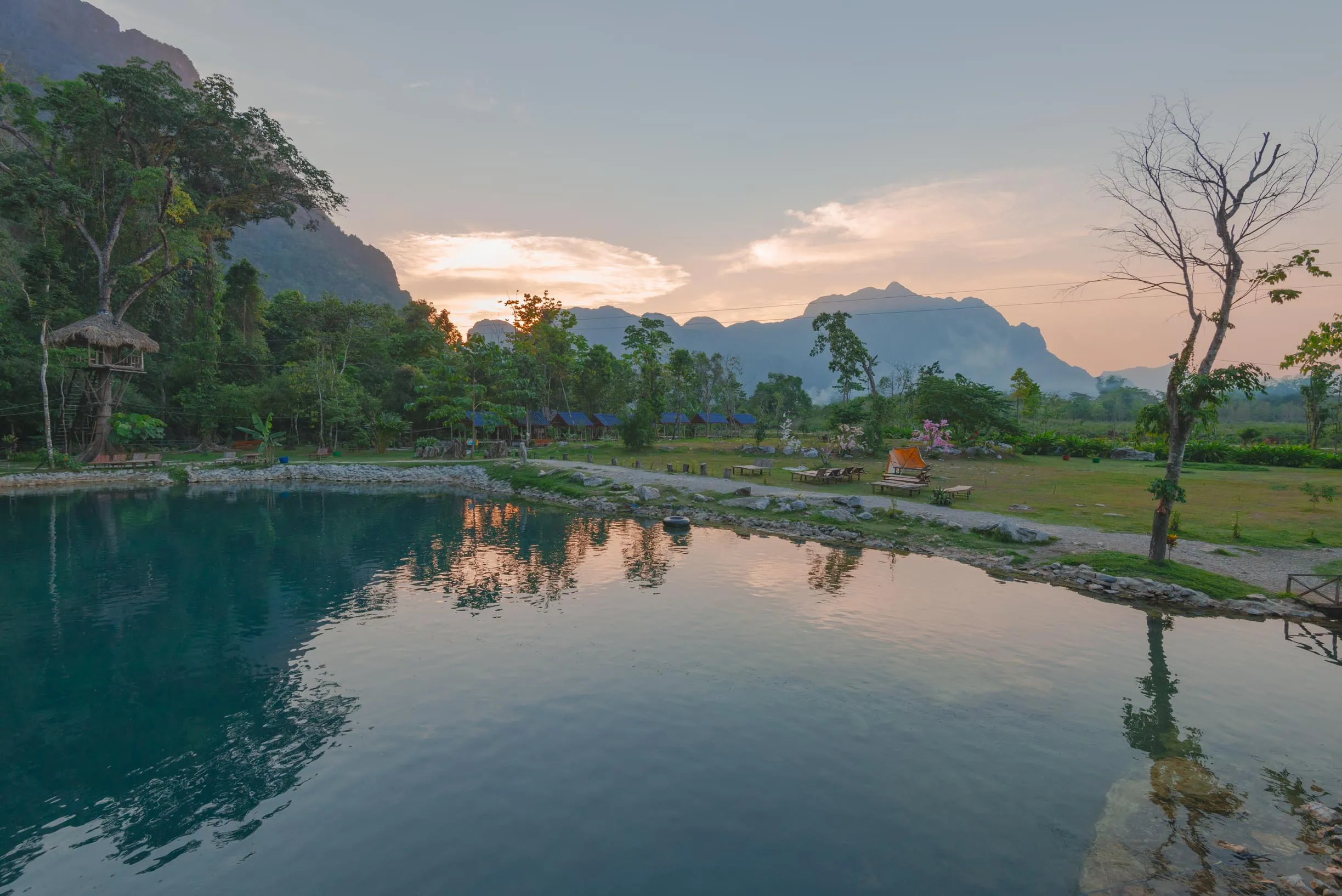 Vang Vieng is a pristine small town between Vientiane and Luang Prabang, with limestone cliffs and paddy fields dotting its landscape.  Given that the Nam Song River runs through the town, water sports such as tubing and kayaking are popular - you'll often see young travellers sitting in large inner tubes floating downstream.  For those who are drawn to water, Vang Vieng is also near Tham Poukham, which has an inviting blue lagoon for tourists to swim in.  The adventurous may also wish to explore the many limestone caves nearby, including one above the lagoon where a golden statue of a sleeping Buddha reside amidst unique rock formations.  Several 16th and 17th monasteries and small Hmong villages are also nearby.  Today, Vang Vieng attracts tourists with its geological beauty and rural appeal.