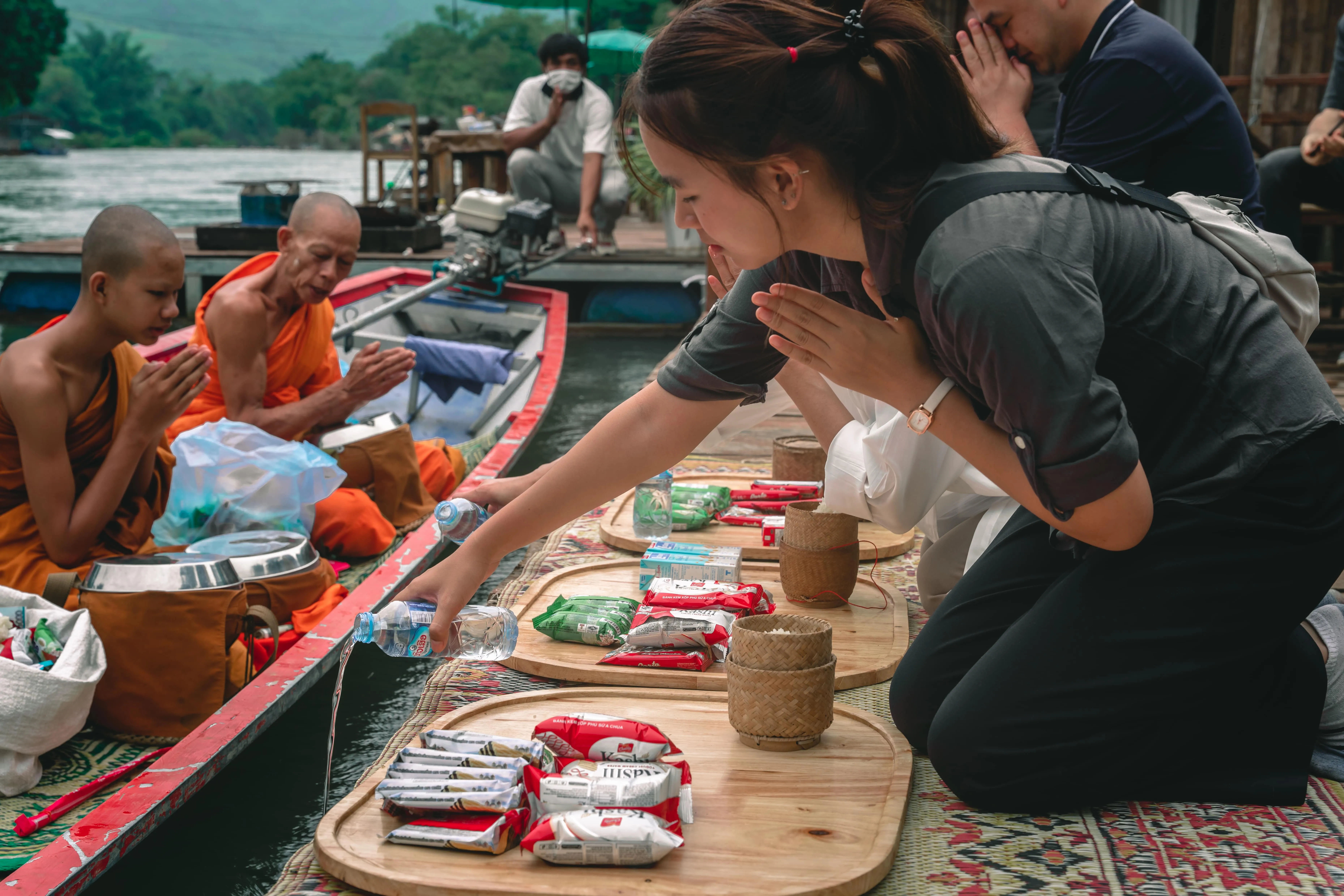 As the procession of saffron-robed monks comes into view, a sense of reverence fills the air. The boat glides slowly alongside the riverbank, allowing visitors to offer their alms directly to the monks. The act of giving is accompanied by a profound silence, creating a serene and meditative ambiance.