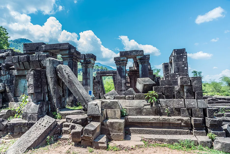 Wat Phou, Laos’ second UNESCO World Heritage Site, sits in the shadow of a holy mountain shaped like a linga, symbolizing the Hindu god Shiva. Dating from between the 11th and 13th centuries, it has been worshipped by Hindu, Buddhist, and animist pilgrims for centuries. It only came to western attention in the 1860s when Frenchmen exploring the Mekong discovered its beauty. It must have been hugely exciting to come across such jungle-choked artistry in the wilds of Southeast Asia. Because of terracing and layout, and jungle trees, grass, and flowers, modern-day pilgrims don’t get to glimpse the entire site at once. Each step is unwrapped, so to speak, as visitors climb higher towards the main sanctuary.