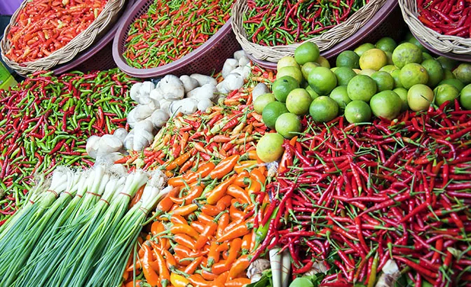 The market, being organic, is seasonal, so don’t expect broccoli or cauliflower or even carrots out of season. In September it’s a very green market, the tables piled with a huge variety of green vegetables, the only other color being the yellow bananas, mangoes and papaya. Expect to see edible flowers, ferns, water plants, great bundles of galangal, soft fresh spring rolls stuffed with omelette, bundles of asparagus looking slim and fresh, piles of freshly harvested beans, silk-based shampoo, fresh passion fruit juice. Pineapples, coconuts, pumpkins, and eggs are sold from the backs of trucks.