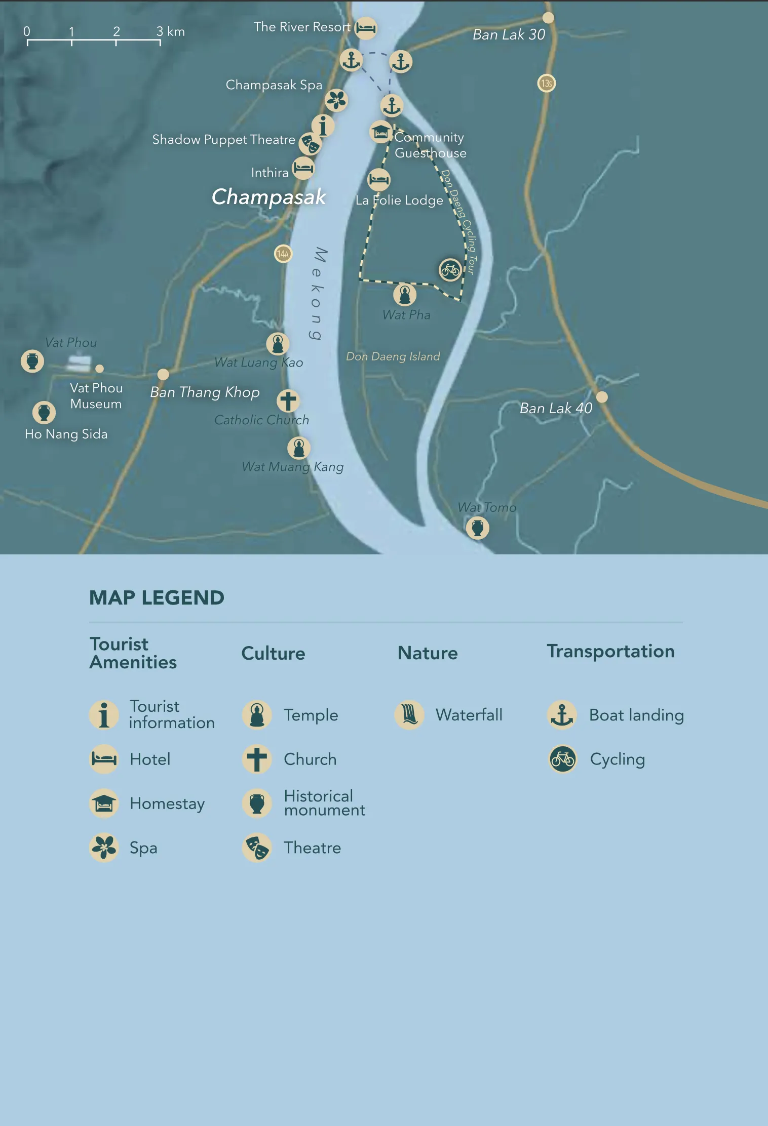 Where to stay: In Champasak, you can find a range of accommodation options, from low-budget guesthouses to up-market hotels, along the two main parallel roads running through the centre of the city. The upmarket River Resort can be found just a few kilometres north of town. You can also stay on Don Daeng Island, either in La Folie Lodge or in a basic community guesthouse or homestay.