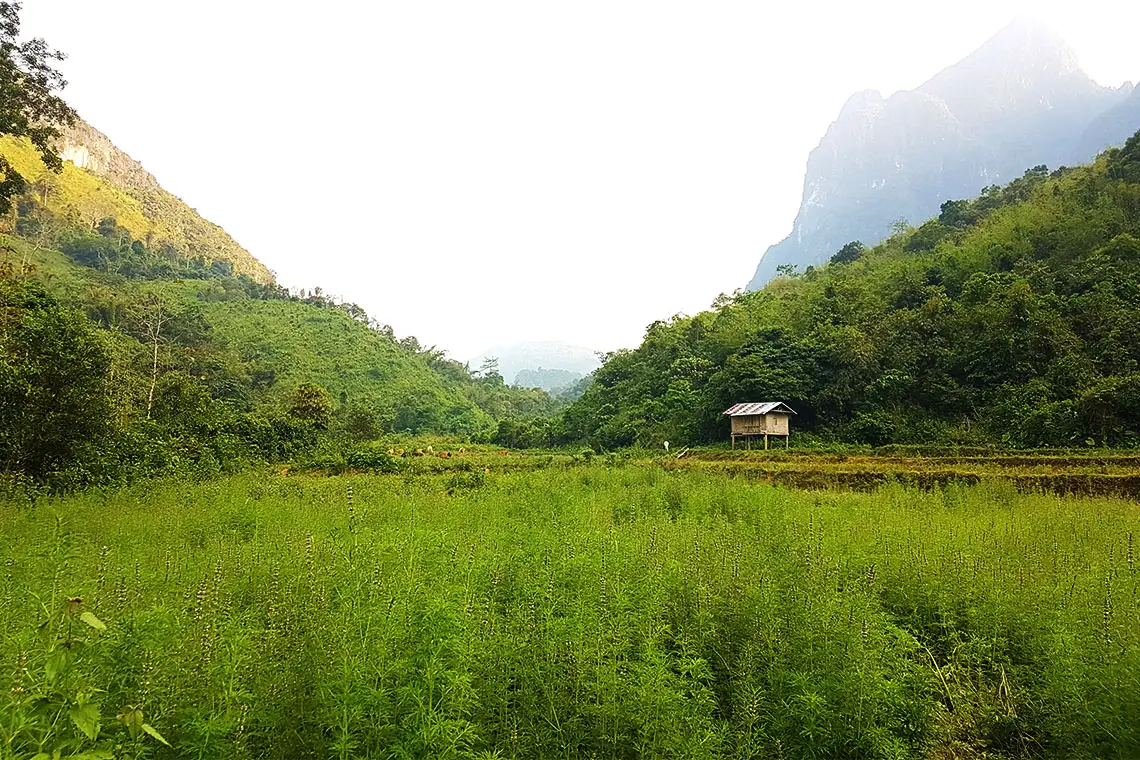 We depart from our office in Nong Khiaw, after a short walk to the boat pier, the boat cruise takes us up the Nam Ou River passing more and more dramatic, limestone cliffs bordering the river, along the way we will visit rural villages of different ethnic groups in Laos, such as, a traditional Lao weaving village, where you can purchase some beautiful hand woven silk or cotton textiles. After that, we return by boat to Ban Muang Ngoi for lunch and we have time for a cup of coffee before we start a small trek through some gorgeous scenery consisting of rice paddy fields. Here we visit a historical cave which was used as a bomb shelter during the Indochina war. After returning to Muang Ngoi we cruise down the river with the beautiful sunset back to Nong Khiaw.