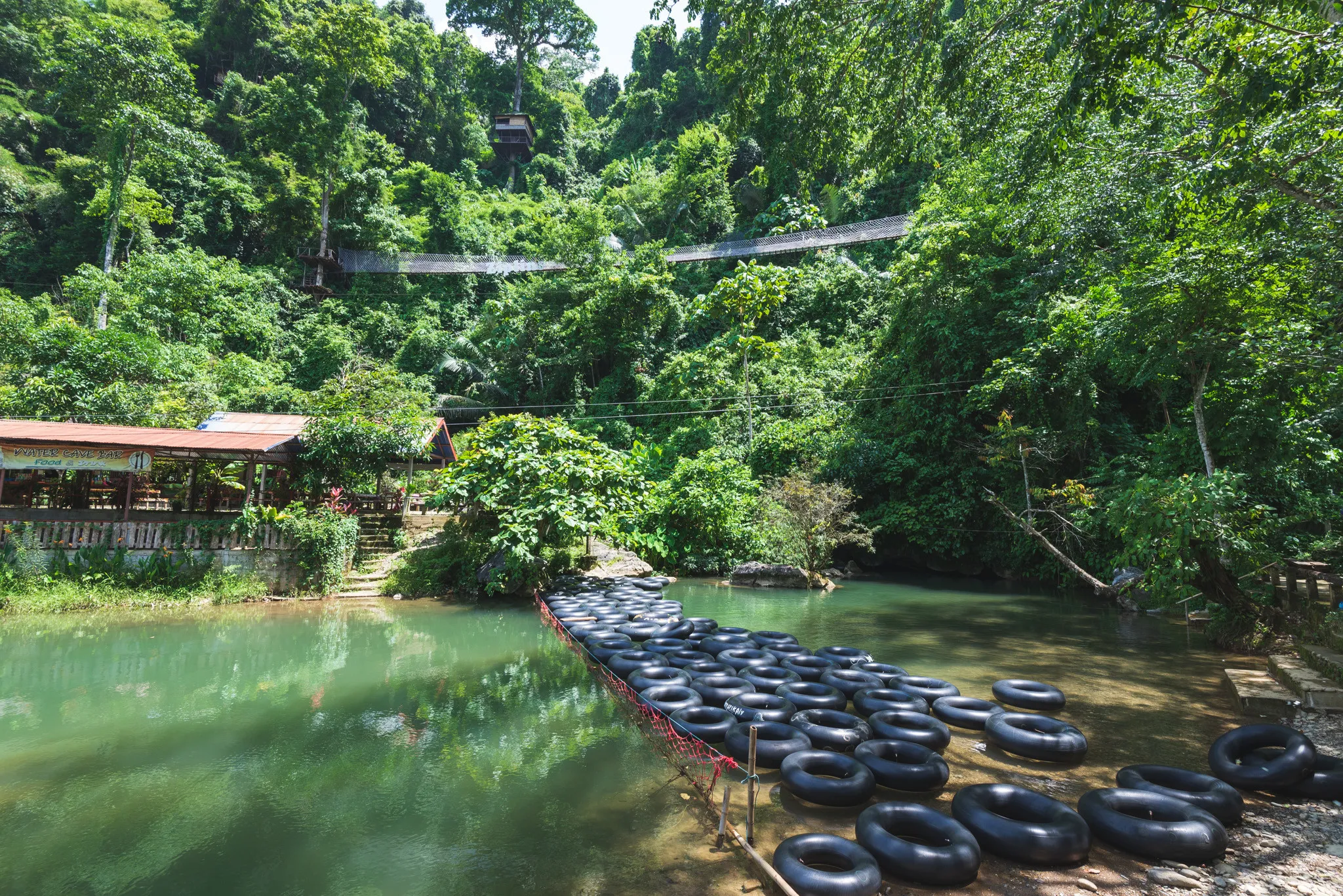 Tham Nam, also referred to as Water Cave, is located approximately 15 kilometers north of Vang Vieng, Laos. It is the highlight of Vang Vieng's cave system. Tubing inside Tham Nam requires the use of ropes to navigate the cave. Following the ropes through the cave, you will have time to admire the cave's fascinating stalactites and pure water.