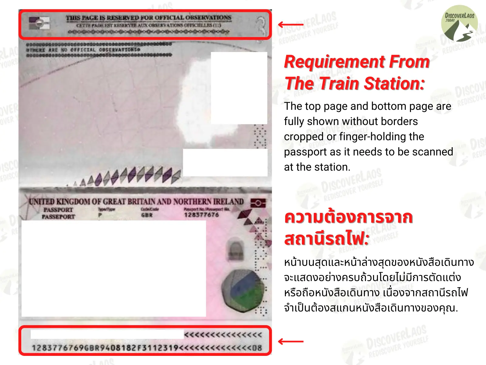 Copies of passports of all travelers who issue tickets with passport numbers attached to their names. The bottom page are fully shown without borders cropped or finger-holding the passport and high resolution as it needs to be scanned at the station. Please send your passport photo to +856 20 59 533 720 (WhatsApp) upon reservation or at least 15 days before departure date. To send your passport photo must be the same phone number that you made the booking reservation.